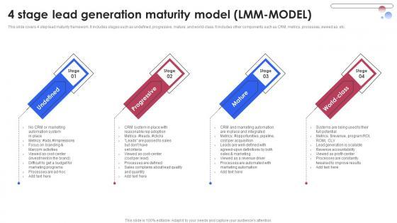 This slide covers 4 step lead maturity framework. It includes stages such as undefined, progressive, mature, and world-class. It includes other components such as CRM, metrics, processes, viewed as, etc. Get a simple yet stunning designed 4 Stage Lead Generation Maturity Model Various Techniques For Managing Formats PDF. It is the best one to establish the tone in your meetings. It is an excellent way to make your presentations highly effective. So, download this PPT today from Slidegeeks and see the positive impacts. Our easy-to-edit 4 Stage Lead Generation Maturity Model Various Techniques For Managing Formats PDF can be your go-to option for all upcoming conferences and meetings. So, what are you waiting for Grab this template today. This slide covers 4 step lead maturity framework. It includes stages such as undefined, progressive, mature, and world-class. It includes other components such as CRM, metrics, processes, viewed as, etc.