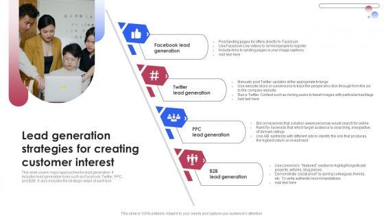 This slide covers major approaches for lead generation. It includes lead generation tools such as Facebook, Twitter, PPC, and B2B. It also includes the strategic steps of each tool. The best PPT templates are a great way to save time, energy, and resources. Slidegeeks have 100 percent editable powerpoint slides making them incredibly versatile. With these quality presentation templates, you can create a captivating and memorable presentation by combining visually appealing slides and effectively communicating your message. Download Lead Generation Strategies For Creating Customer Various Techniques For Managing Ideas PDF from Slidegeeks and deliver a wonderful presentation. This slide covers major approaches for lead generation. It includes lead generation tools such as Facebook, Twitter, PPC, and B2B. It also includes the strategic steps of each tool.