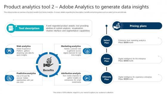 This slide provides an overview of product analytic tool Adobe Analytics. It covers details regarding tool description, benefits and pricing plans such as select, prime and ultimateDo you have an important presentation coming up Are you looking for something that will make your presentation stand out from the rest Look no further than Product Analytics Tool 2 Adobe Analytics To Generate Driving Business Success Integrating Product. With our professional designs, you can trust that your presentation will pop and make delivering it a smooth process. And with Slidegeeks, you can trust that your presentation will be unique and memorable. So why wait Grab Product Analytics Tool 2 Adobe Analytics To Generate Driving Business Success Integrating Product today and make your presentation stand out from the rest This slide provides an overview of product analytic tool Adobe Analytics. It covers details regarding tool description, benefits and pricing plans such as select, prime and ultimate
