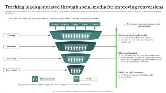 This slide covers an overview of social media leads for increasing customer conversion rates. It also includes strategies to generate more social media leads, such as optimizing your profile, using social lead ads, and offering the right incentive. If your project calls for a presentation, then Slidegeeks is your go to partner because we have professionally designed, easy to edit templates that are perfect for any presentation. After downloading, you can easily edit Tracking Leads Generated Through Social Media Online Marketing Analytics To Enhance Business Growth Rules PDF and make the changes accordingly. You can rearrange slides or fill them with different images. Check out all the handy templates