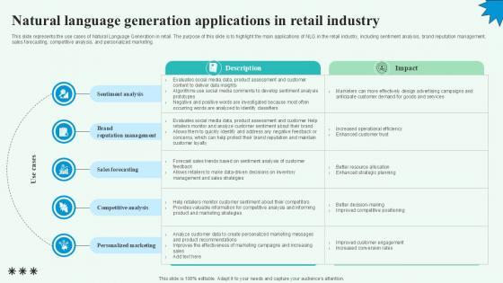 This slide represents the use cases of Natural Language Generation in retail. The purpose of this slide is to highlight the main applications of NLG in the retail industry, including sentiment analysis, brand reputation management, sales forecasting, competitive analysis, and personalized marketing. This Natural Language Generation Applications In Retail Industry PPT Presentation from Slidegeeks makes it easy to present information on your topic with precision. It provides customization options, so you can make changes to the colors, design, graphics, or any other component to create a unique layout. It is also available for immediate download, so you can begin using it right away. Slidegeeks has done good research to ensure that you have everything you need to make your presentation stand out. Make a name out there for a brilliant performance. This slide represents the use cases of Natural Language Generation in retail. The purpose of this slide is to highlight the main applications of NLG in the retail industry, including sentiment analysis, brand reputation management, sales forecasting, competitive analysis, and personalized marketing.