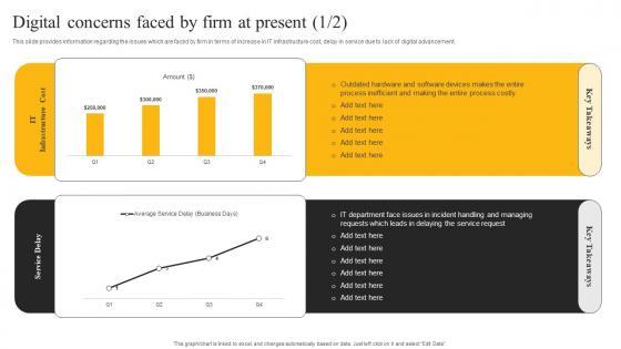 This slide provides information regarding the issues which are faced by firm in terms of increase in IT infrastructure cost, delay in service due to lack of digital advancement. Present like a pro with Digital Concerns Faced By Firm At Present E Sales Generation Checklist Template PDF Create beautiful presentations together with your team, using our easy-to-use presentation slides. Share your ideas in real-time and make changes on the fly by downloading our templates. So whether you are in the office, on the go, or in a remote location, you can stay in sync with your team and present your ideas with confidence. With Slidegeeks presentation got a whole lot easier. Grab these presentations today. This slide provides information regarding the issues which are faced by firm in terms of increase in IT infrastructure cost, delay in service due to lack of digital advancement.