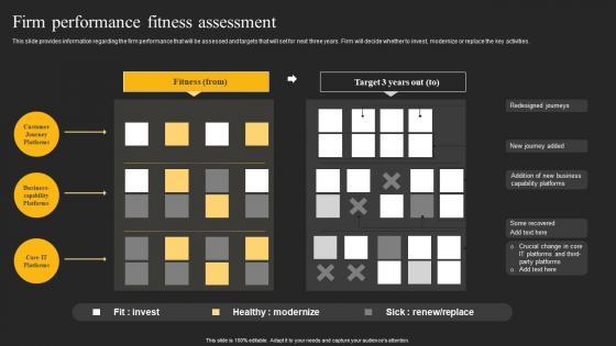 This slide provides information regarding the firm performance that will be assessed and targets that will set for next three years. Firm will decide whether to invest, modernize or replace the key activities. Find highly impressive Firm Performance Fitness Assessment E Sales Generation Checklist Graphics PDF on Slidegeeks to deliver a meaningful presentation. You can save an ample amount of time using these presentation templates. No need to worry to prepare everything from scratch because Slidegeeks experts have already done a huge research and work for you. You need to download Firm Performance Fitness Assessment E Sales Generation Checklist Graphics PDF for your upcoming presentation. All the presentation templates are 100 percent editable and you can change the color and personalize the content accordingly. Download now This slide provides information regarding the firm performance that will be assessed and targets that will set for next three years. Firm will decide whether to invest, modernize or replace the key activities.