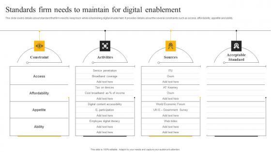 The slide covers details about standard that firm need to keep track while establishing digital enablement. It provides details about the several constraints such as access, affordability, appetite and ability. Welcome to our selection of the Standards Firm Needs To Maintain For Digital E Sales Generation Checklist Pictures PDF. These are designed to help you showcase your creativity and bring your sphere to life. Planning and Innovation are essential for any business that is just starting out. This collection contains the designs that you need for your everyday presentations. All of our PowerPoints are 100 percent editable, so you can customize them to suit your needs. This multi-purpose template can be used in various situations. Grab these presentation templates today The slide covers details about standard that firm need to keep track while establishing digital enablement. It provides details about the several constraints such as access, affordability, appetite and ability.