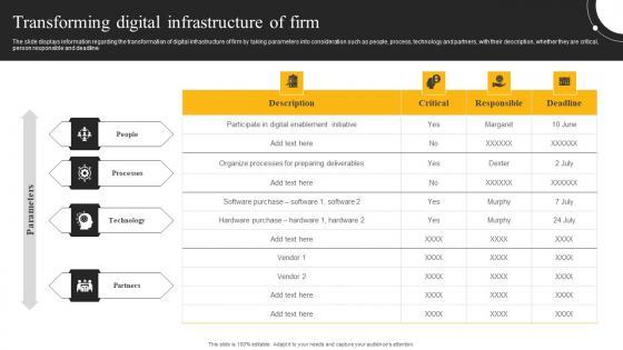 The slide displays information regarding the transformation of digital infrastructure of firm by taking parameters into consideration such as people, process, technology and partners, with their description, whether they are critical, person responsible and deadline. The Transforming Digital Infrastructure Of Firm E Sales Generation Checklist Introduction PDF is a compilation of the most recent design trends as a series of slides. It is suitable for any subject or industry presentation, containing attractive visuals and photo spots for businesses to clearly express their messages. This template contains a variety of slides for the user to input data, such as structures to contrast two elements, bullet points, and slides for written information. Slidegeeks is prepared to create an impression. The slide displays information regarding the transformation of digital infrastructure of firm by taking parameters into consideration such as people, process, technology and partners, with their description, whether they are critical, person responsible and deadline.