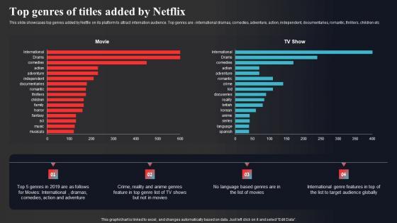 This slide showcases top genres added by Netflix on its platform to attract internation audience. Top genres are international dramas, comedies, adventure, action, independent, documentaries, romantic, thrillers, children etc. If your project calls for a presentation, then Slidegeeks is your go to partner because we have professionally designed, easy to edit templates that are perfect for any presentation. After downloading, you can easily edit Decoding Netflix Strategies Drives OTT Market Dominance Top Genres Of Titles Added Mockup PDF and make the changes accordingly. You can rearrange slides or fill them with different images. Check out all the handy templates