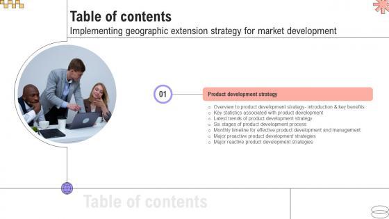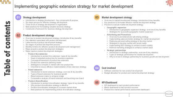 Here you can discover an assortment of the finest PowerPoint and Google Slides templates. With these templates, you can create presentations for a variety of purposes while simultaneously providing your audience with an eye-catching visual experience. Download Table Of Content Implementing Geographic Extension Strategy For Market PPT PowerPoint Strategy SS V to deliver an impeccable presentation. These templates will make your job of preparing presentations much quicker, yet still, maintain a high level of quality. Slidegeeks has experienced researchers who prepare these templates and write high-quality content for you. Later on, you can personalize the content by editing the Table Of Content Implementing Geographic Extension Strategy For Market PPT PowerPoint Strategy SS V. Our Table Of Content Implementing Geographic Extension Strategy For Market PPT PowerPoint Strategy SS V are topically designed to provide an attractive backdrop to any subject. Use them to look like a presentation pro.