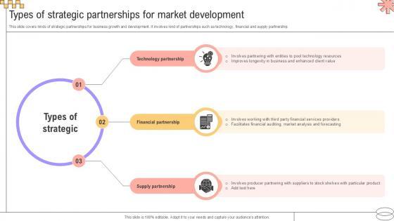 This slide covers kinds of strategic partnerships for business growth and development. It involves kind of partnerships such as technology, financial and supply partnership. The best PPT templates are a great way to save time, energy, and resources. Slidegeeks have 100 percent editable powerpoint slides making them incredibly versatile. With these quality presentation templates, you can create a captivating and memorable presentation by combining visually appealing slides and effectively communicating your message. Download Types Of Strategic Partnerships Implementing Geographic Extension PPT Presentation Strategy SS V from Slidegeeks and deliver a wonderful presentation. This slide covers kinds of strategic partnerships for business growth and development. It involves kind of partnerships such as technology, financial and supply partnership.