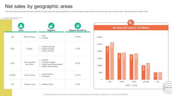 This slide outlines overview of net sales of Nestle company based on regional distribution. It consists of regions such as North America, Europe, Asia, Oceania, Africa, Latin America and Greater China. Welcome to our selection of the Net Sales By Geographic Areas FMCG Provider Company Profile CP SS V. These are designed to help you showcase your creativity and bring your sphere to life. Planning and Innovation are essential for any business that is just starting out. This collection contains the designs that you need for your everyday presentations. All of our PowerPoints are 100 percent editable, so you can customize them to suit your needs. This multi-purpose template can be used in various situations. Grab these presentation templates today. This slide outlines overview of net sales of Nestle company based on regional distribution. It consists of regions such as North America, Europe, Asia, Oceania, Africa, Latin America and Greater China.