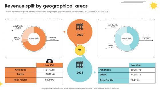 This slide represents a comparison of revenue split by Ernst and Young company geographical areas Americas, EMEIA, and Asia-pacific for 2022 and 2021.This modern and well-arranged Revenue Split By Geographical Areas Professional Services And Tax Advisory Company Profile CP SS V provides lots of creative possibilities. It is very simple to customize and edit with the Powerpoint Software. Just drag and drop your pictures into the shapes. All facets of this template can be edited with Powerpoint, no extra software is necessary. Add your own material, put your images in the places assigned for them, adjust the colors, and then you can show your slides to the world, with an animated slide included. This slide represents a comparison of revenue split by Ernst and Young company geographical areas Americas, EMEIA, and Asia-pacific for 2022 and 2021.