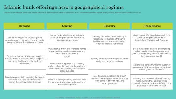 This slide covers the details related to the different categories of financial contracts offered by Islamic banks. It also includes details related to deposits, lending, treasury, and trade finance based on shariah law. Do you know about Slidesgeeks Islamic Bank Offerings Across Geographical Regions Comprehensive Guide To Islamic Professional Pdf These are perfect for delivering any kind od presentation. Using it, create PowerPoint presentations that communicate your ideas and engage audiences. Save time and effort by using our pre-designed presentation templates that are perfect for a wide range of topic. Our vast selection of designs covers a range of styles, from creative to business, and are all highly customizable and easy to edit. Download as a PowerPoint template or use them as Google Slides themes. This slide covers the details related to the different categories of financial contracts offered by Islamic banks. It also includes details related to deposits, lending, treasury, and trade finance based on shariah law.
