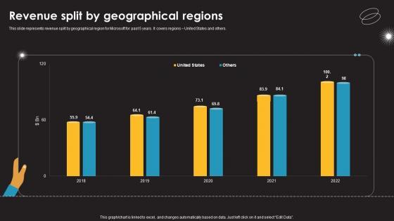This slide represents revenue spilt by geographical region for Microsoft for past 5 years. It covers regions United States and others.Explore a selection of the finest Revenue Split By Geographical Regions Information Technology Services Provider Company Profile CP SS V here. With a plethora of professionally designed and pre-made slide templates, you can quickly and easily find the right one for your upcoming presentation. You can use our Revenue Split By Geographical Regions Information Technology Services Provider Company Profile CP SS V to effectively convey your message to a wider audience. Slidegeeks has done a lot of research before preparing these presentation templates. The content can be personalized and the slides are highly editable. Grab templates today from Slidegeeks. This slide represents revenue spilt by geographical region for Microsoft for past 5 years. It covers regions United States and others.