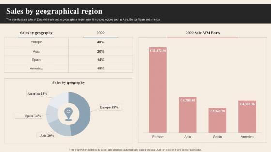 The slide illustrate sales of Zara clothing brand by geographical region wise. It includes regions such as Asia, Europe Spain and America. Here you can discover an assortment of the finest PowerPoint and Google Slides templates. With these templates, you can create presentations for a variety of purposes while simultaneously providing your audience with an eye-catching visual experience. Download Sales By Geographical Region Branded Clothing Company Profile PPT Example CP SS V to deliver an impeccable presentation. These templates will make your job of preparing presentations much quicker, yet still, maintain a high level of quality. Slidegeeks has experienced researchers who prepare these templates and write high-quality content for you. Later on, you can personalize the content by editing the Sales By Geographical Region Branded Clothing Company Profile PPT Example CP SS V. The slide illustrate sales of Zara clothing brand by geographical region wise. It includes regions such as Asia, Europe Spain and America.