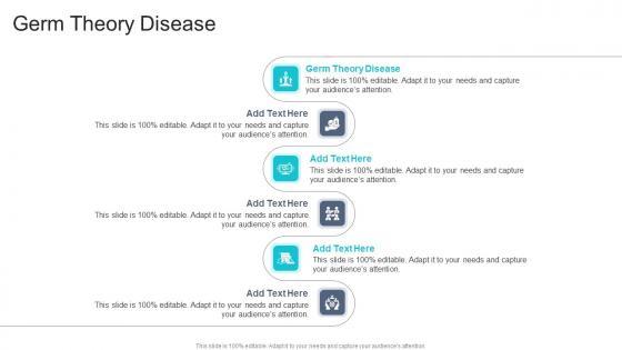 Introducing our well designed Germ Theory Disease In Powerpoint And Google Slides Cpb. This PowerPoint design presents information on topics like Germ Theory Disease. As it is predesigned it helps boost your confidence level. It also makes you a better presenter because of its high quality content and graphics. This PPT layout can be downloaded and used in different formats like PDF, PNG, and JPG. Not only this, it is available in both Standard Screen and Widescreen aspect ratios for your convenience. Therefore, click on the download button now to persuade and impress your audience. Our Germ Theory Disease In Powerpoint And Google Slides Cpb are topically designed to provide an attractive backdrop to any subject. Use them to look like a presentation pro.