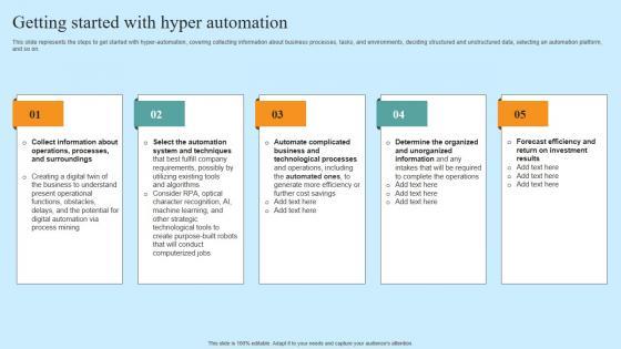This slide represents the steps to get started with hyper-automation, covering collecting information about business processes, tasks, and environments, deciding structured and unstructured data, selecting an automation platform, and so on. Formulating a presentation can take up a lot of effort and time, so the content and message should always be the primary focus. The visuals of the PowerPoint can enhance the presenters message, so our Getting Started With Hyper Automation Hyper Automation Solutions Professional Pdf was created to help save time. Instead of worrying about the design, the presenter can concentrate on the message while our designers work on creating the ideal templates for whatever situation is needed. Slidegeeks has experts for everything from amazing designs to valuable content, we have put everything into Getting Started With Hyper Automation Hyper Automation Solutions Professional Pdf This slide represents the steps to get started with hyper-automation, covering collecting information about business processes, tasks, and environments, deciding structured and unstructured data, selecting an automation platform, and so on.