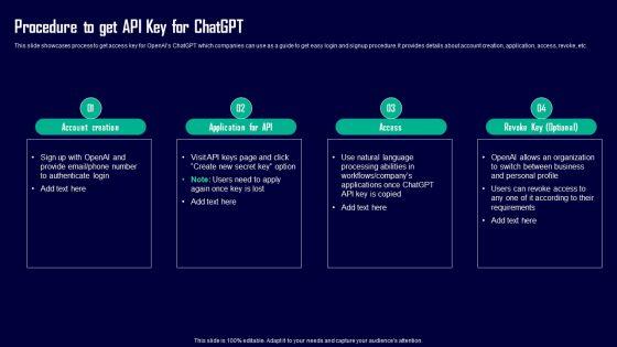 This slide showcases process to get access key for OpenAIs ChatGPT which companies can use as a guide to get easy login and signup procedure. It provides details about account creation, application, access, revoke, etc. Retrieve professionally designed Leveraging Openai API For Business Procedure To Get API Key For Chatgpt Microsoft PDF to effectively convey your message and captivate your listeners. Save time by selecting pre made slideshows that are appropriate for various topics, from business to educational purposes. These themes come in many different styles, from creative to corporate, and all of them are easily adjustable and can be edited quickly. Access them as PowerPoint templates or as Google Slides themes. You do not have to go on a hunt for the perfect presentation because Slidegeeks got you covered from everywhere.