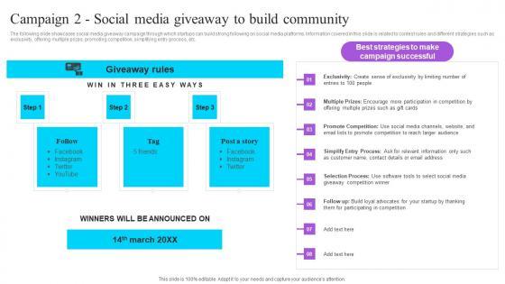 The following slide showcases social media giveaway campaign through which startups can build strong following on social media platforms. Information covered in this slide is related to contest rules and different strategies such as exclusivity, offering multiple prizes, promoting competition, simplifying entry process, etc. Do you have to make sure that everyone on your team knows about any specific topic I yes, then you should give Comprehensive Guide To Build Marketing Campaign 2 Social Media Giveaway To Build Community Elements PDF a try. Our experts have put a lot of knowledge and effort into creating this impeccable Comprehensive Guide To Build Marketing Campaign 2 Social Media Giveaway To Build Community Elements PDF. You can use this template for your upcoming presentations, as the slides are perfect to represent even the tiniest detail. You can download these templates from the Slidegeeks website and these are easy to edit. So grab these today