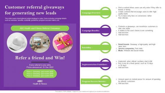 This slide covers client referral contest strategy to sales. It also includes campaign details such as overview, benefits, suitability, guidelines, program success metrics, etc. Present like a pro with Customer Referral Giveaways For Generating New Sales Techniques For Achieving Designs Pdf Create beautiful presentations together with your team, using our easy to use presentation slides. Share your ideas in real time and make changes on the fly by downloading our templates. So whether you are in the office, on the go, or in a remote location, you can stay in sync with your team and present your ideas with confidence. With Slidegeeks presentation got a whole lot easier. Grab these presentations today. This slide covers client referral contest strategy to sales. It also includes campaign details such as overview, benefits, suitability, guidelines, program success metrics, etc.