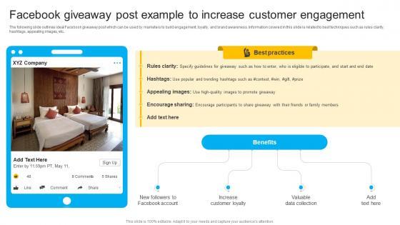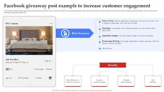 The following slide outlines ideal Facebook giveaway post which can be used by marketers to build engagement, loyalty, and brand awareness. Information covered in this slide is related to best techniques such as rules clarity, hashtags, appealing images, etc. Slidegeeks is one of the best resources for PowerPoint templates. You can download easily and regulate Facebook Giveaway Post Example To Increase Customer Engagement Download PDF for your personal presentations from our wonderful collection. A few clicks is all it takes to discover and get the most relevant and appropriate templates. Use our Templates to add a unique zing and appeal to your presentation and meetings. All the slides are easy to edit and you can use them even for advertisement purposes.