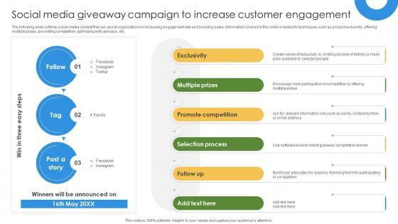 The following slide outlines social media contest that can assist organizations in increasing engagement rate and boosting sales. Information covered in this slide is related to techniques such as product exclusivity, offering multiple prizes, promoting competition, optimizing entry process, etc. Do you have to make sure that everyone on your team knows about any specific topic I yes, then you should give Marketing Growth Strategy Social Media Giveaway Campaign To Increase Customer Strategy SS V a try. Our experts have put a lot of knowledge and effort into creating this impeccable Marketing Growth Strategy Social Media Giveaway Campaign To Increase Customer Strategy SS V. You can use this template for your upcoming presentations, as the slides are perfect to represent even the tiniest detail. You can download these templates from the Slidegeeks website and these are easy to edit. So grab these today The following slide outlines social media contest that can assist organizations in increasing engagement rate and boosting sales. Information covered in this slide is related to techniques such as product exclusivity, offering multiple prizes, promoting competition, optimizing entry process, etc.
