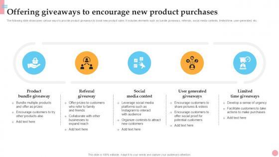 The following slide showcases various ways to provide product giveaways to boost new product sales. It includes elements such as bundle giveaways, referrals, social media contests, limited-time, user-generated, etc. Are you searching for a Offering Giveaways To Encourage How To Improve Company PPT Powerpoint Strategy SS V that is uncluttered, straightforward, and original Its easy to edit, and you can change the colors to suit your personal or business branding. For a presentation that expresses how much effort you have put in, this template is ideal With all of its features, including tables, diagrams, statistics, and lists, its perfect for a business plan presentation. Make your ideas more appealing with these professional slides. Download Offering Giveaways To Encourage How To Improve Company PPT Powerpoint Strategy SS V from Slidegeeks today. The following slide showcases various ways to provide product giveaways to boost new product sales. It includes elements such as bundle giveaways, referrals, social media contests, limited-time, user-generated, etc.