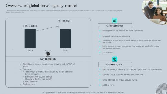 This slide provides glimpse about summary of international travel business for understanding its growing market and utilizing the opportunities. It includes CAGR, growth drivers, global players, etc. This Overview Of Global Travel Agency Market Tours And Travel Business Advertising Designs Pdf from Slidegeeks makes it easy to present information on your topic with precision. It provides customization options, so you can make changes to the colors, design, graphics, or any other component to create a unique layout. It is also available for immediate download, so you can begin using it right away. Slidegeeks has done good research to ensure that you have everything you need to make your presentation stand out. Make a name out there for a brilliant performance. This slide provides glimpse about summary of international travel business for understanding its growing market and utilizing the opportunities. It includes CAGR, growth drivers, global players, etc.