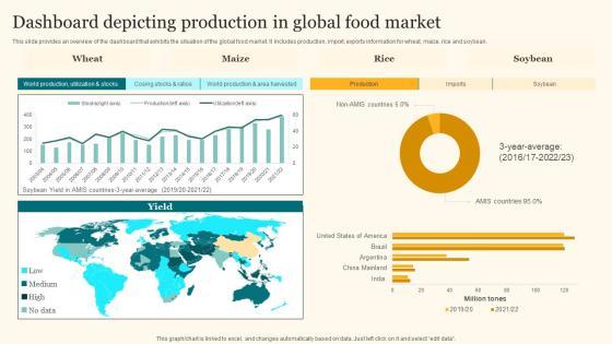 This slide provides an overview of the dashboard that exhibits the situation of the global food market. It includes production, import, exports information for wheat, maize, rice and soybean. Are you in need of a template that can accommodate all of your creative concepts This one is crafted professionally and can be altered to fit any style. Use it with Google Slides or PowerPoint. Include striking photographs, symbols, depictions, and other visuals. Fill, move around, or remove text boxes as desired. Test out color palettes and font mixtures. Edit and save your work, or work with colleagues. Download Dashboard Depicting Production In Global Agricultural Product Promotion Template Pdf and observe how to make your presentation outstanding. Give an impeccable presentation to your group and make your presentation unforgettable. This slide provides an overview of the dashboard that exhibits the situation of the global food market. It includes production, import, exports information for wheat, maize, rice and soybean.