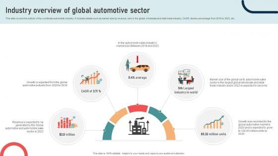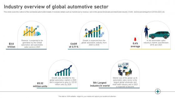 This slide covers the outlook of the worldwide automobile industry. It includes details such as market size by revenue, rank in the global wholesale and retail trade industry, CAGR, decline percentage from 2018 to 2023, etc. Formulating a presentation can take up a lot of effort and time, so the content and message should always be the primary focus. The visuals of the PowerPoint can enhance the presenters message, so our Guide To Building A Successful Industry Overview Of Global Automotive Sector Strategy SS V was created to help save time. Instead of worrying about the design, the presenter can concentrate on the message while our designers work on creating the ideal templates for whatever situation is needed. Slidegeeks has experts for everything from amazing designs to valuable content, we have put everything into Guide To Building A Successful Industry Overview Of Global Automotive Sector Strategy SS V This slide covers the outlook of the worldwide automobile industry. It includes details such as market size by revenue, rank in the global wholesale and retail trade industry, CAGR, decline percentage from 2018 to 2023, etc.