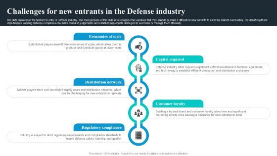 The slide showcases the barriers to entry in Defense industry. The main purpose of this slide is to recognize the variables that may impede or make it difficult for new entrants to enter the market successfully. By identifying these impediments, aspiring Defense companies can make educated judgements and establish appropriate strategies to overcome or manage them efficiently. Want to ace your presentation in front of a live audience Our Challenges For New Entrants In Global Security Industry PPT Example IR SS V can help you do that by engaging all the users towards you. Slidegeeks experts have put their efforts and expertise into creating these impeccable powerpoint presentations so that you can communicate your ideas clearly. Moreover, all the templates are customizable, and easy-to-edit and downloadable. Use these for both personal and commercial use. The slide showcases the barriers to entry in Defense industry. The main purpose of this slide is to recognize the variables that may impede or make it difficult for new entrants to enter the market successfully. By identifying these impediments, aspiring Defense companies can make educated judgements and establish appropriate strategies to overcome or manage them efficiently.