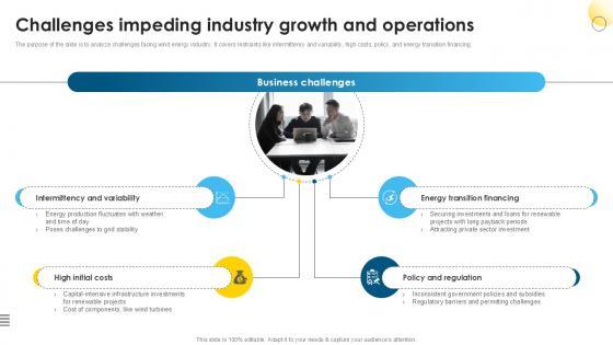 The purpose of the slide is to analyze challenges facing wind energy industry. It covers restraints like intermittency and variability, high costs, policy, and energy transition financing. Boost your pitch with our creative Challenges Impeding Industry Global Wind Power Market PPT Example IR SS V. Deliver an awe-inspiring pitch that will mesmerize everyone. Using these presentation templates you will surely catch everyones attention. You can browse the ppts collection on our website. We have researchers who are experts at creating the right content for the templates. So you do not have to invest time in any additional work. Just grab the template now and use them. The purpose of the slide is to analyze challenges facing wind energy industry. It covers restraints like intermittency and variability, high costs, policy, and energy transition financing.