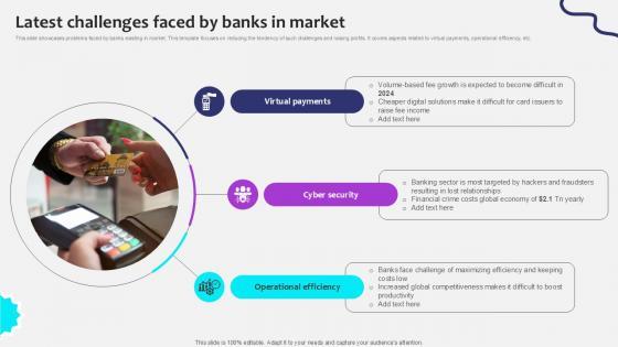 This slide showcases problems faced by banks existing in market. This template focuses on reducing the tendency of such challenges and raising profits. It covers aspects related to virtual payments, operational efficiency, etc. Coming up with a presentation necessitates that the majority of the effort goes into the content and the message you intend to convey. The visuals of a PowerPoint presentation can only be effective if it supplements and supports the story that is being told. Keeping this in mind our experts created Latest Challenges Faced By Initiating Globalization Of Banking Ppt Slide to reduce the time that goes into designing the presentation. This way, you can concentrate on the message while our designers take care of providing you with the right template for the situation. This slide showcases problems faced by banks existing in market. This template focuses on reducing the tendency of such challenges and raising profits. It covers aspects related to virtual payments, operational efficiency, etc.