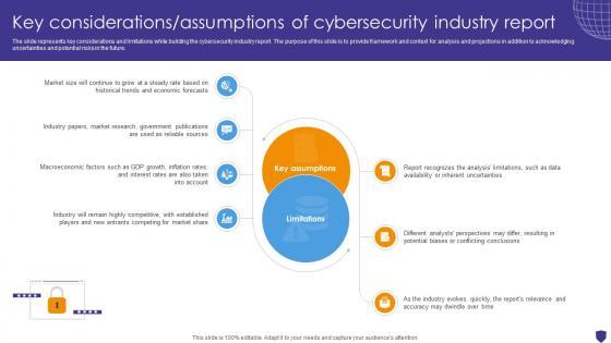 The slide represents key considerations and limitations while building the cybersecurity industry report. The purpose of this slide is to provide framework and context for analysis and projections in addition to acknowledging uncertainties and potential risks in the future. Make sure to capture your audiences attention in your business displays with our gratis customizable Global Data Security Industry Report Key Considerations Assumptions Of Cybersecurity Industry Report IR SS V. These are great for business strategies, office conferences, capital raising or task suggestions. If you desire to acquire more customers for your tech business and ensure they stay satisfied, create your own sales presentation with these plain slides. The slide represents key considerations and limitations while building the cybersecurity industry report. The purpose of this slide is to provide framework and context for analysis and projections in addition to acknowledging uncertainties and potential risks in the future.