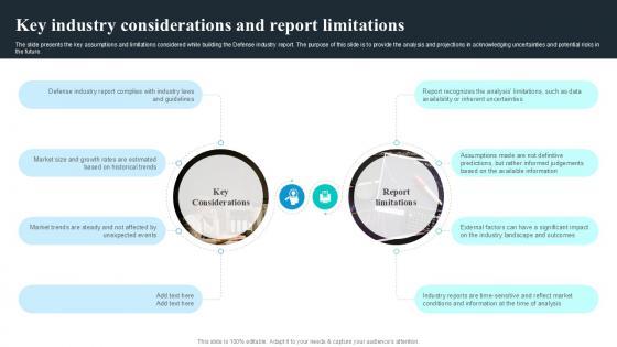 The slide covers the segmentation analysis in the Defense industry report. It includes attributes related to technology, type of product, services, distribution channel, geographical analysis, and key market player profile. The slide presents the key assumptions and limitations considered while building the Defense industry report. The purpose of this slide is to provide the analysis and projections in acknowledging uncertainties and potential risks in the future. Make sure to capture your audiences attention in your business displays with our gratis customizable Key Industry Considerations And Report Global Security Industry PPT PowerPoint IR SS V. These are great for business strategies, office conferences, capital raising or task suggestions. If you desire to acquire more customers for your tech business and ensure they stay satisfied, create your own sales presentation with these plain slides. The slide covers the segmentation analysis in the Defense industry report. It includes attributes related to technology, type of product, services, distribution channel, geographical analysis, and key market player profile.