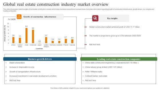 This slide showcases market insights of real estate construction industry which helps business assess there business share. It provides information regarding growth of construction infrastructure, growth drivers, key insights and leading companies. Pitch your topic with ease and precision using this Global Real Estate Construction Industry Market Overview Formats Pdf. This layout presents information on Business Growth Drivers, Construction Companies. It is also available for immediate download and adjustment. So, changes can be made in the color, design, graphics or any other component to create a unique layout. This slide showcases market insights of real estate construction industry which helps business assess there business share. It provides information regarding growth of construction infrastructure, growth drivers, key insights and leading companies.