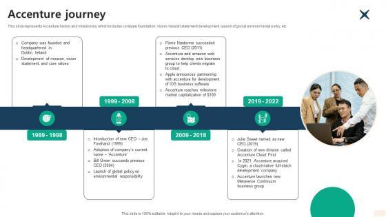 This slide represents Accenture history and milestones, which includes company foundation. Vision mission statement development, launch of global environmental policy, etcFind a pre-designed and impeccable Accenture Journey Global Consulting And Technology Services Company Profile CP SS V. The templates can ace your presentation without additional effort. You can download these easy-to-edit presentation templates to make your presentation stand out from others. So, what are you waiting for Download the template from Slidegeeks today and give a unique touch to your presentation. This slide represents Accenture history and milestones, which includes company foundation. Vision mission statement development, launch of global environmental policy, etc