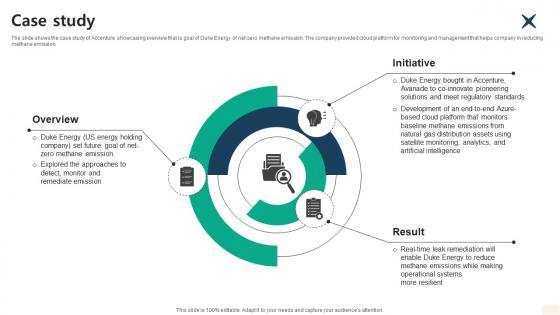 The slide shows the case study of Accenture showcasing overview that is goal of Duke Energy of net-zero methane emission. The company provided cloud platform for monitoring and management that helps company in reducing methane emission.Want to ace your presentation in front of a live audience Our Case Study Global Consulting And Technology Services Company Profile CP SS V can help you do that by engaging all the users towards you. Slidegeeks experts have put their efforts and expertise into creating these impeccable powerpoint presentations so that you can communicate your ideas clearly. Moreover, all the templates are customizable, and easy-to-edit and downloadable. Use these for both personal and commercial use. The slide shows the case study of Accenture showcasing overview that is goal of Duke Energy of net-zero methane emission. The company provided cloud platform for monitoring and management that helps company in reducing methane emission.