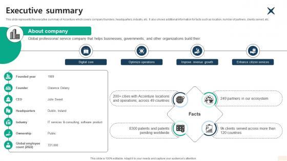 This slide represents the executive summary of Accenture which covers company founders, headquarters, industry, etc. It also shows additional information for facts such as location, number of partners, clients served, etc.If you are looking for a format to display your unique thoughts, then the professionally designed Executive Summary Global Consulting And Technology Services Company Profile CP SS V is the one for you. You can use it as a Google Slides template or a PowerPoint template. Incorporate impressive visuals, symbols, images, and other charts. Modify or reorganize the text boxes as you desire. Experiment with shade schemes and font pairings. Alter, share or cooperate with other people on your work. Download Executive Summary Global Consulting And Technology Services Company Profile CP SS V and find out how to give a successful presentation. Present a perfect display to your team and make your presentation unforgettable. This slide represents the executive summary of Accenture which covers company founders, headquarters, industry, etc. It also shows additional information for facts such as location, number of partners, clients served, etc.