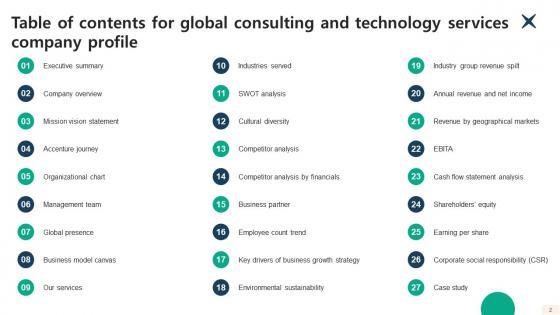 Retrieve professionally designed Table Of Contents For Global Consulting And Technology Services Company Profile CP SS V to effectively convey your message and captivate your listeners. Save time by selecting pre-made slideshows that are appropriate for various topics, from business to educational purposes. These themes come in many different styles, from creative to corporate, and all of them are easily adjustable and can be edited quickly. Access them as PowerPoint templates or as Google Slides themes. You do not have to go on a hunt for the perfect presentation because Slidegeeks got you covered from everywhere. Our Table Of Contents For Global Consulting And Technology Services Company Profile CP SS V are topically designed to provide an attractive backdrop to any subject. Use them to look like a presentation pro.