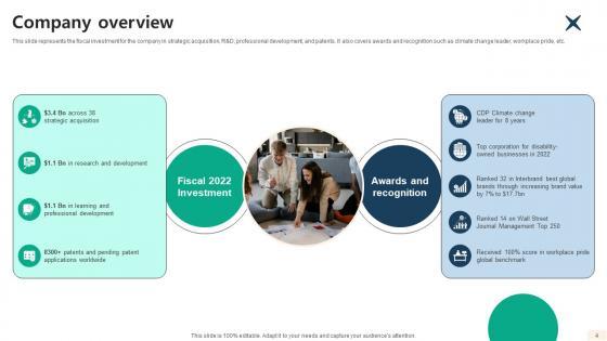 This slide represents the fiscal investment for the company in strategic acquisition, RandD, professional development, and patents. It also covers awards and recognition such as climate change leader, workplace pride, etc.Do you have to make sure that everyone on your team knows about any specific topic I yes, then you should give Company Overview Global Consulting And Technology Services Company Profile CP SS V a try. Our experts have put a lot of knowledge and effort into creating this impeccable Company Overview Global Consulting And Technology Services Company Profile CP SS V. You can use this template for your upcoming presentations, as the slides are perfect to represent even the tiniest detail. You can download these templates from the Slidegeeks website and these are easy to edit. So grab these today This slide represents the fiscal investment for the company in strategic acquisition, RandD, professional development, and patents. It also covers awards and recognition such as climate change leader, workplace pride, etc.