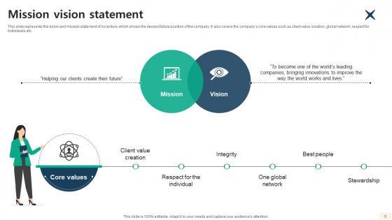 This slide represents the vision and mission statement of Accenture which shows the desired future position of the company. It also covers the companys core values such as client value creation, global network, respect for individuals etc.This Mission Vision Statement Global Consulting And Technology Services Company Profile CP SS V is perfect for any presentation, be it in front of clients or colleagues. It is a versatile and stylish solution for organizing your meetings. The Mission Vision Statement Global Consulting And Technology Services Company Profile CP SS V features a modern design for your presentation meetings. The adjustable and customizable slides provide unlimited possibilities for acing up your presentation. Slidegeeks has done all the homework before launching the product for you. So, do not wait, grab the presentation templates today This slide represents the vision and mission statement of Accenture which shows the desired future position of the company. It also covers the companys core values such as client value creation, global network, respect for individuals etc.