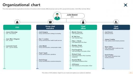 This slide represents the organizational structure of Accenture which includes different groups such as CEO, group chief executive, chief officer ad chair officer.Welcome to our selection of the Organizational Chart Global Consulting And Technology Services Company Profile CP SS V. These are designed to help you showcase your creativity and bring your sphere to life. Planning and Innovation are essential for any business that is just starting out. This collection contains the designs that you need for your everyday presentations. All of our PowerPoints are 100 percent editable, so you can customize them to suit your needs. This multi-purpose template can be used in various situations. Grab these presentation templates today. This slide represents the organizational structure of Accenture which includes different groups such as CEO, group chief executive, chief officer ad chair officer.