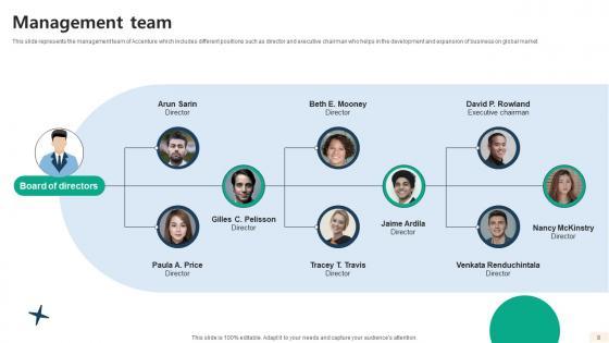 This slide represents the management team of Accenture which includes different positions such as director and executive chairman who helps in the development and expansion of business on global market.This modern and well-arranged Management Team Global Consulting And Technology Services Company Profile CP SS V provides lots of creative possibilities. It is very simple to customize and edit with the Powerpoint Software. Just drag and drop your pictures into the shapes. All facets of this template can be edited with Powerpoint, no extra software is necessary. Add your own material, put your images in the places assigned for them, adjust the colors, and then you can show your slides to the world, with an animated slide included. This slide represents the management team of Accenture which includes different positions such as director and executive chairman who helps in the development and expansion of business on global market.