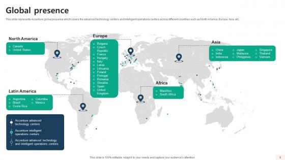 This slide represents Accenture global presence which covers the advanced technology centers and intelligent operations centers across different countries such as North America, Europe, Asia, etc.Are you in need of a template that can accommodate all of your creative concepts This one is crafted professionally and can be altered to fit any style. Use it with Google Slides or PowerPoint. Include striking photographs, symbols, depictions, and other visuals. Fill, move around, or remove text boxes as desired. Test out color palettes and font mixtures. Edit and save your work, or work with colleagues. Download Global Presence Global Consulting And Technology Services Company Profile CP SS V and observe how to make your presentation outstanding. Give an impeccable presentation to your group and make your presentation unforgettable. This slide represents Accenture global presence which covers the advanced technology centers and intelligent operations centers across different countries such as North America, Europe, Asia, etc.
