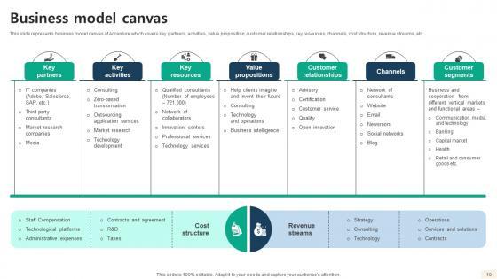 This slide represents business model canvas of Accenture which covers key partners, activities, value proposition, customer relationships, key resources, channels, cost structure, revenue streams, etc.Create an editable Business Model Canvas Global Consulting And Technology Services Company Profile CP SS V that communicates your idea and engages your audience. Whether you are presenting a business or an educational presentation, pre-designed presentation templates help save time. Business Model Canvas Global Consulting And Technology Services Company Profile CP SS V is highly customizable and very easy to edit, covering many different styles from creative to business presentations. Slidegeeks has creative team members who have crafted amazing templates. So, go and get them without any delay. This slide represents business model canvas of Accenture which covers key partners, activities, value proposition, customer relationships, key resources, channels, cost structure, revenue streams, etc.