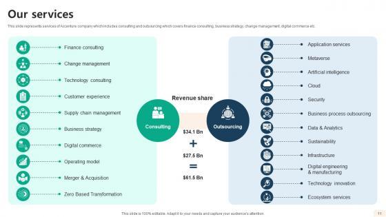 This slide represents services of Accenture company which includes consulting and outsourcing which covers finance consulting, business strategy, change management, digital commerce etc.Explore a selection of the finest Our Services Global Consulting And Technology Services Company Profile CP SS V here. With a plethora of professionally designed and pre-made slide templates, you can quickly and easily find the right one for your upcoming presentation. You can use our Our Services Global Consulting And Technology Services Company Profile CP SS V to effectively convey your message to a wider audience. Slidegeeks has done a lot of research before preparing these presentation templates. The content can be personalized and the slides are highly editable. Grab templates today from Slidegeeks. This slide represents services of Accenture company which includes consulting and outsourcing which covers finance consulting, business strategy, change management, digital commerce etc.
