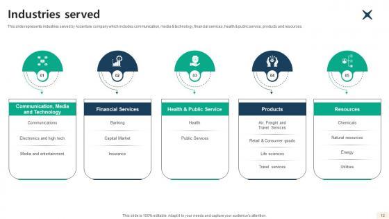 This slide represents industries served by Accenture company which includes communication, media and technology, financial services, health and public service, products and resources.Make sure to capture your audiences attention in your business displays with our gratis customizable Industries Served Global Consulting And Technology Services Company Profile CP SS V. These are great for business strategies, office conferences, capital raising or task suggestions. If you desire to acquire more customers for your tech business and ensure they stay satisfied, create your own sales presentation with these plain slides. This slide represents industries served by Accenture company which includes communication, media and technology, financial services, health and public service, products and resources.