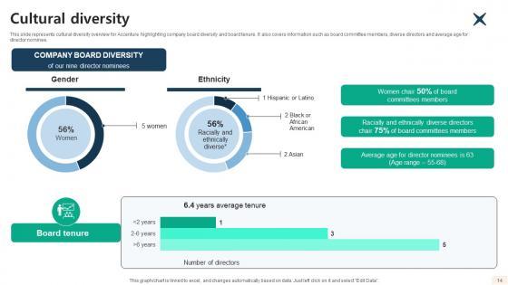 This slide represents cultural diversity overview for Accenture highlighting company board diversity and board tenure. It also covers information such as board committee members, diverse directors and average age for director nominee.Slidegeeks is here to make your presentations a breeze with Cultural Diversity Global Consulting And Technology Services Company Profile CP SS V With our easy-to-use and customizable templates, you can focus on delivering your ideas rather than worrying about formatting. With a variety of designs to choose from, you are sure to find one that suits your needs. And with animations and unique photos, illustrations, and fonts, you can make your presentation pop. So whether you are giving a sales pitch or presenting to the board, make sure to check out Slidegeeks first This slide represents cultural diversity overview for Accenture highlighting company board diversity and board tenure. It also covers information such as board committee members, diverse directors and average age for director nominee.