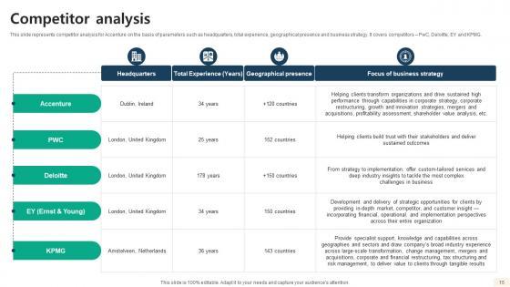 This slide represents competitor analysis for Accenture on the basis of parameters such as headquarters, total experience, geographical presence and business strategy. It covers competitors PwC, Deloitte, EY and KPMG.From laying roadmaps to briefing everything in detail, our templates are perfect for you. You can set the stage with your presentation slides. All you have to do is download these easy-to-edit and customizable templates. Competitor Analysis Global Consulting And Technology Services Company Profile CP SS V will help you deliver an outstanding performance that everyone would remember and praise you for. Do download this presentation today. This slide represents competitor analysis for Accenture on the basis of parameters such as headquarters, total experience, geographical presence and business strategy. It covers competitors PwC, Deloitte, EY and KPMG.