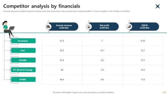 This slide represents competitor analysis for Accenture on the basis of parameters such as annual revenue, net profit and EBITA. It covers competitors PwC, Deloitte, EY and KPMG.Get a simple yet stunning designed Competitor Analysis By Financials Global Consulting And Technology Services Company Profile CP SS V. It is the best one to establish the tone in your meetings. It is an excellent way to make your presentations highly effective. So, download this PPT today from Slidegeeks and see the positive impacts. Our easy-to-edit Competitor Analysis By Financials Global Consulting And Technology Services Company Profile CP SS V can be your go-to option for all upcoming conferences and meetings. So, what are you waiting for Grab this template today. This slide represents competitor analysis for Accenture on the basis of parameters such as annual revenue, net profit and EBITA. It covers competitors PwC, Deloitte, EY and KPMG.