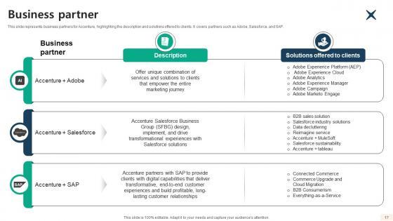 This slide represents business partners for Accenture, highlighting the description and solutions offered to clients. It covers partners such as Adobe, Salesforce, and SAP.Slidegeeks is one of the best resources for PowerPoint templates. You can download easily and regulate Business Partner Global Consulting And Technology Services Company Profile CP SS V for your personal presentations from our wonderful collection. A few clicks is all it takes to discover and get the most relevant and appropriate templates. Use our Templates to add a unique zing and appeal to your presentation and meetings. All the slides are easy to edit and you can use them even for advertisement purposes. This slide represents business partners for Accenture, highlighting the description and solutions offered to clients. It covers partners such as Adobe, Salesforce, and SAP.